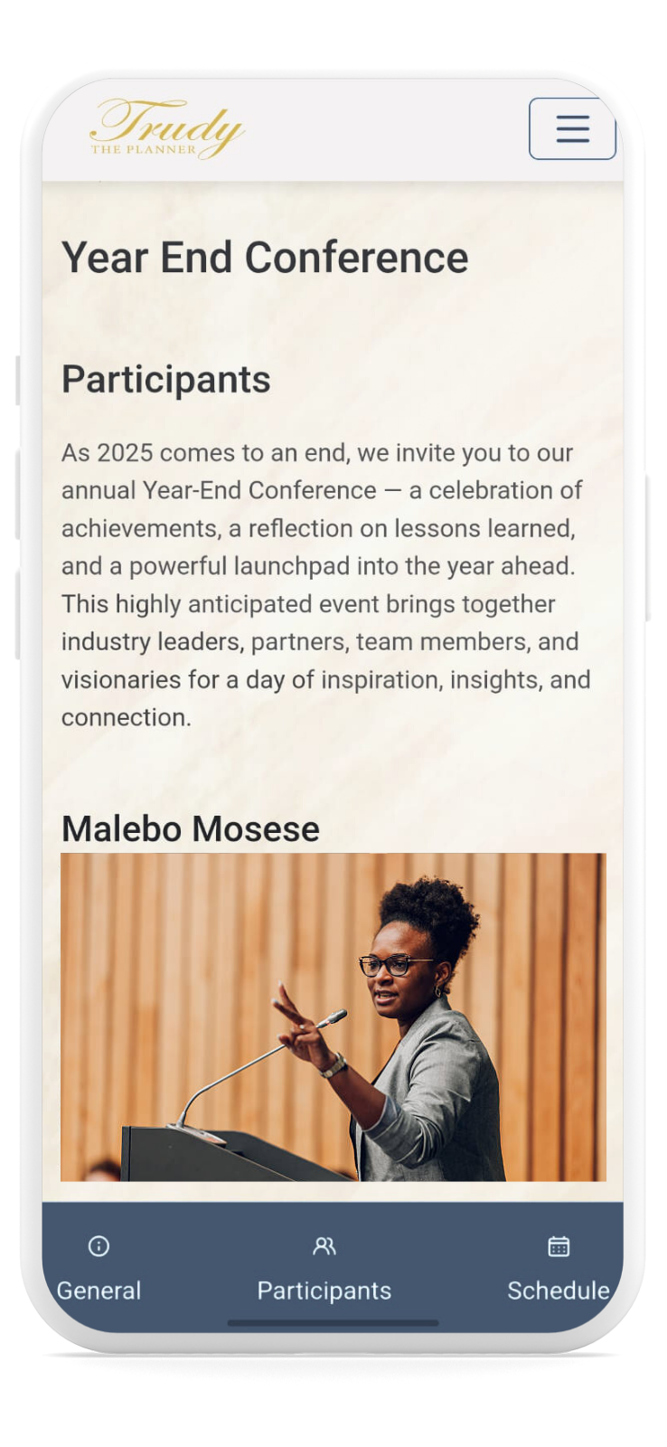 Delivers short, timely updates such as “Room change,” “Speaker delayed,” or “Lunch extended,” ensuring everyone stays aligned in real time.